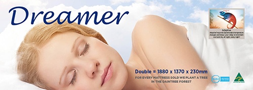 The New Australian Made Dreamer mattress consits of 3 layers of the most technologically Advanced, envirometally friendly foams. A firm base layer, a support layer and a comfort layer. The mattress is designed to breath, letting hot air escape and letting cool air circulate. Dreamer eliminates partner disturbance.